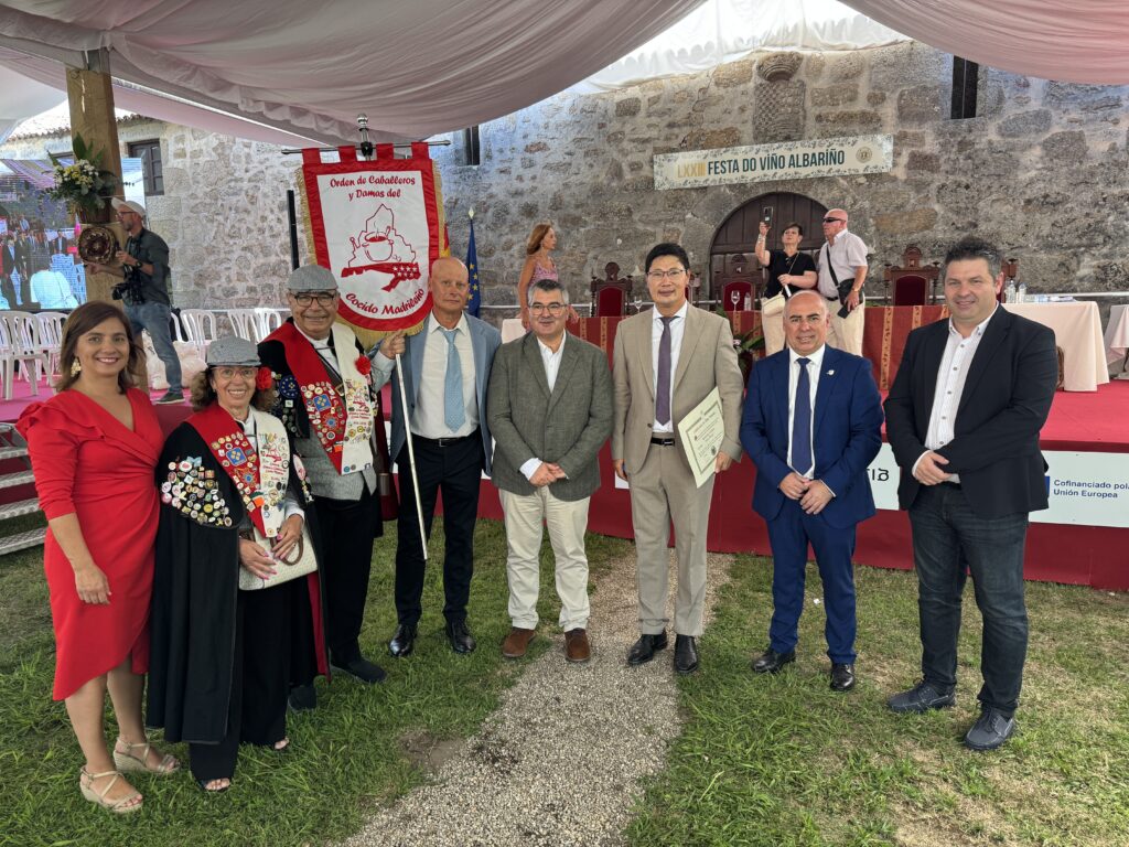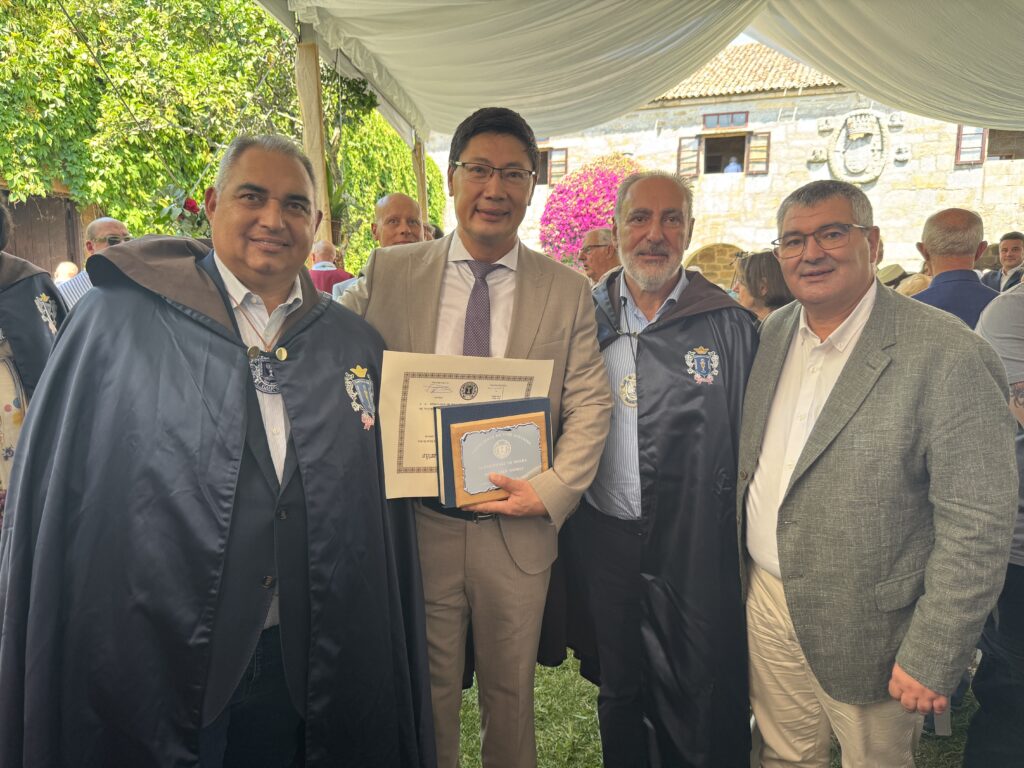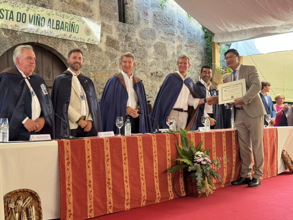 在节庆核心仪式——尊贵阿尔巴利诺骑士团(Capítulo Serenísimo do Albariño)授勋仪式上,西班牙中国工商联合会主席陈胜利先生被授予“荣誉阿尔巴利诺人(Albariñense de Honra)”称号,以表彰其在促进中西经济、人文与葡萄酒领域交流方面所展现的积极推动力。这是首次有华人获此殊荣,具有重要象征意义。
